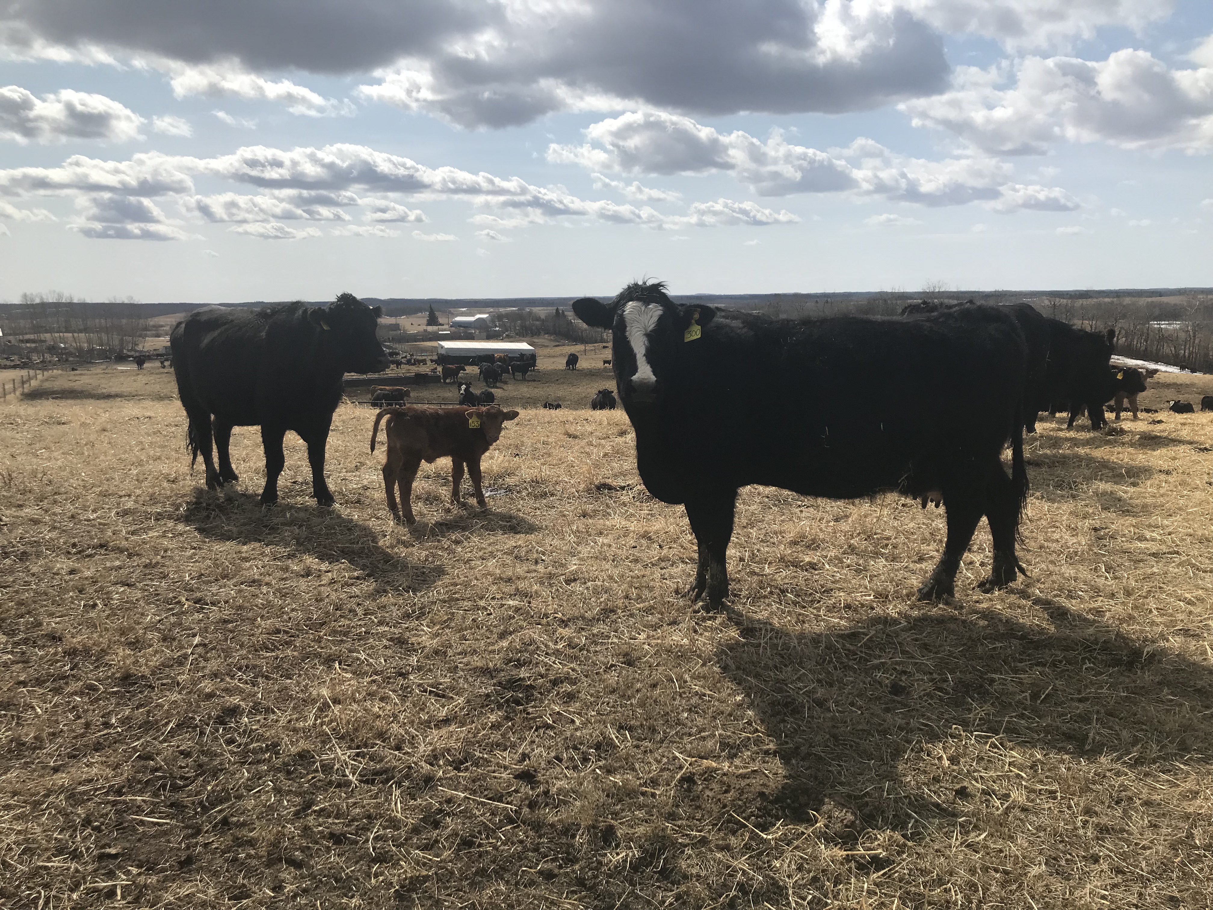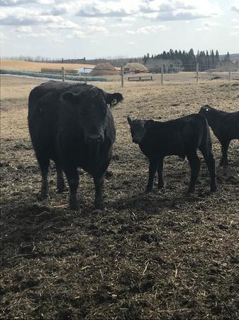 200 Black Angus and Angus cross cows with Black Simmental calves at side.