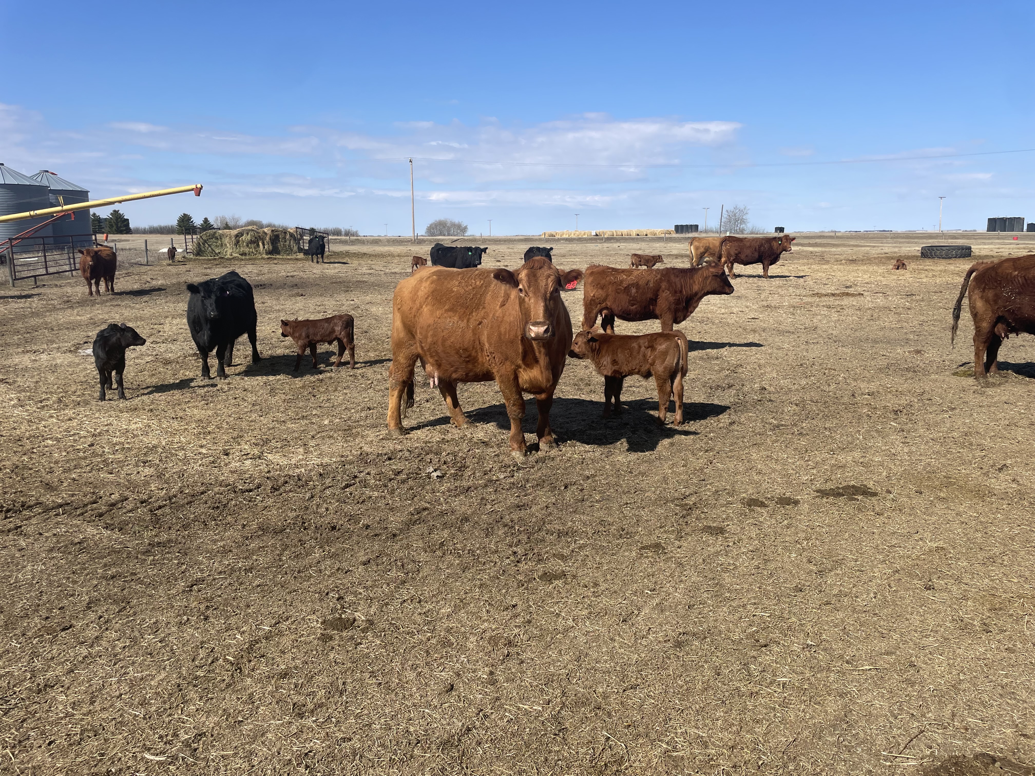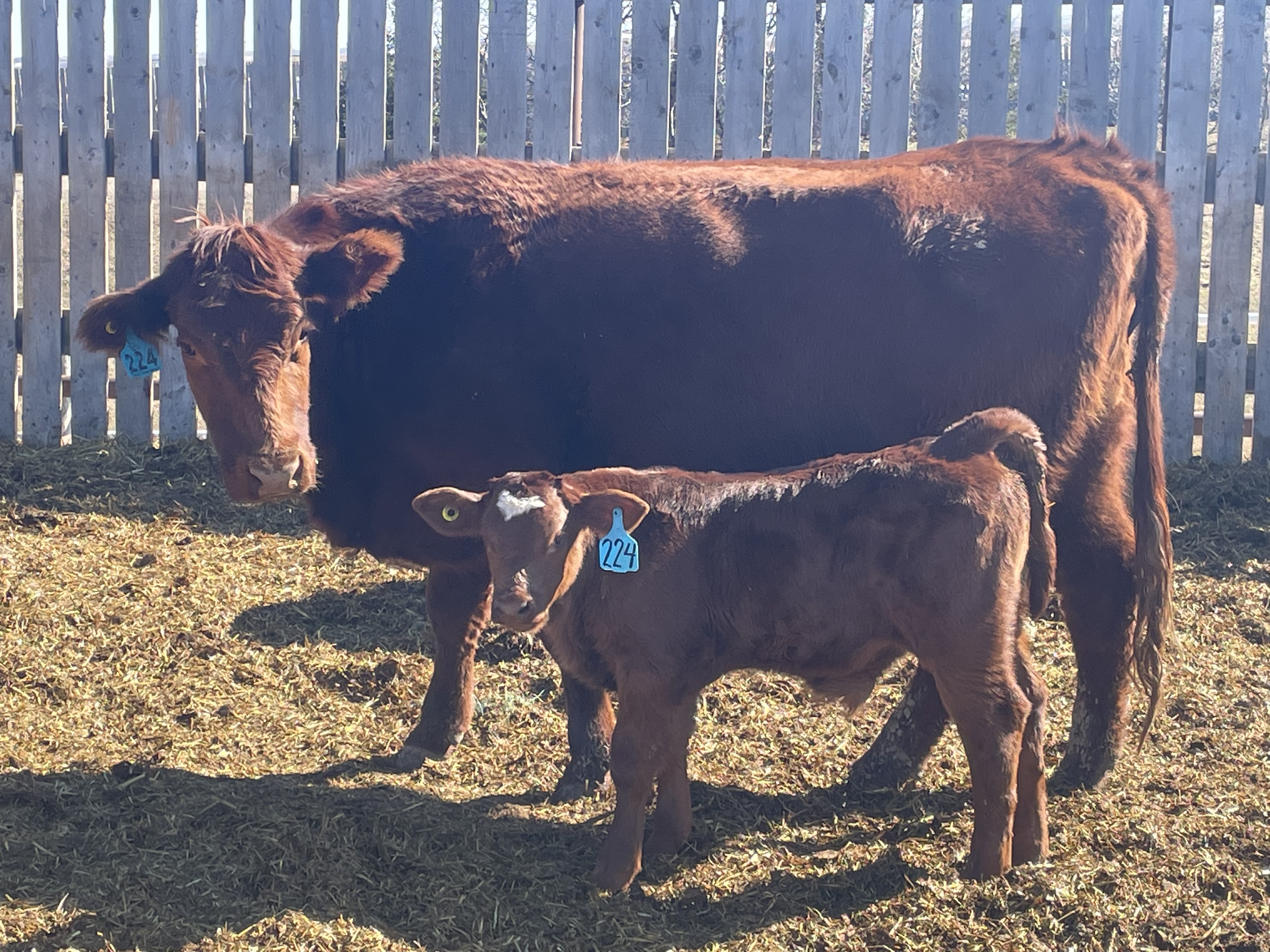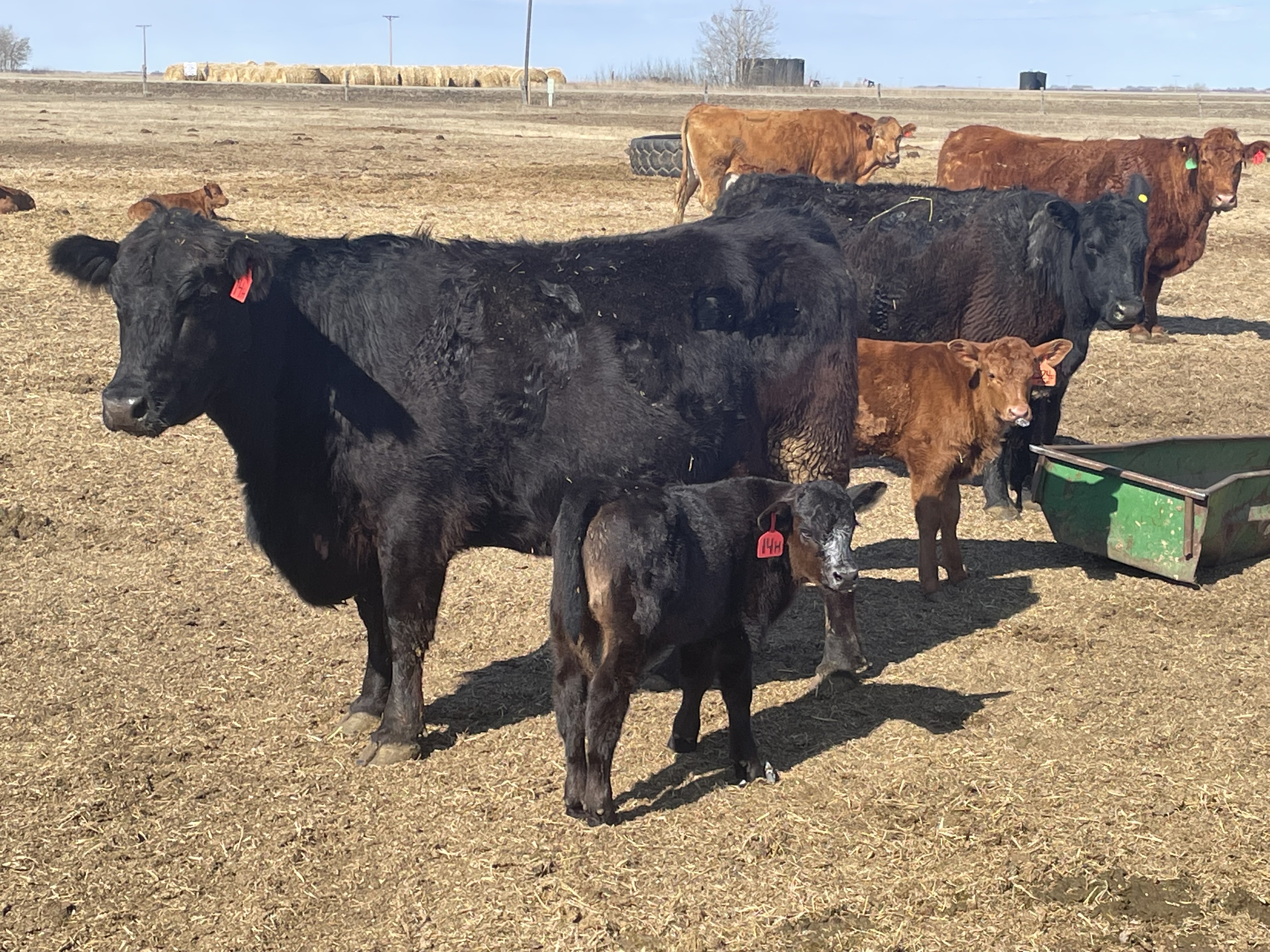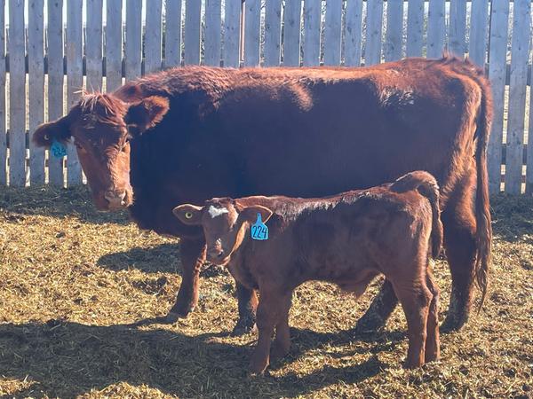 25 first calves, Red, Red Baldies and RWF Traditionals with Red & Black Angus calves at side.