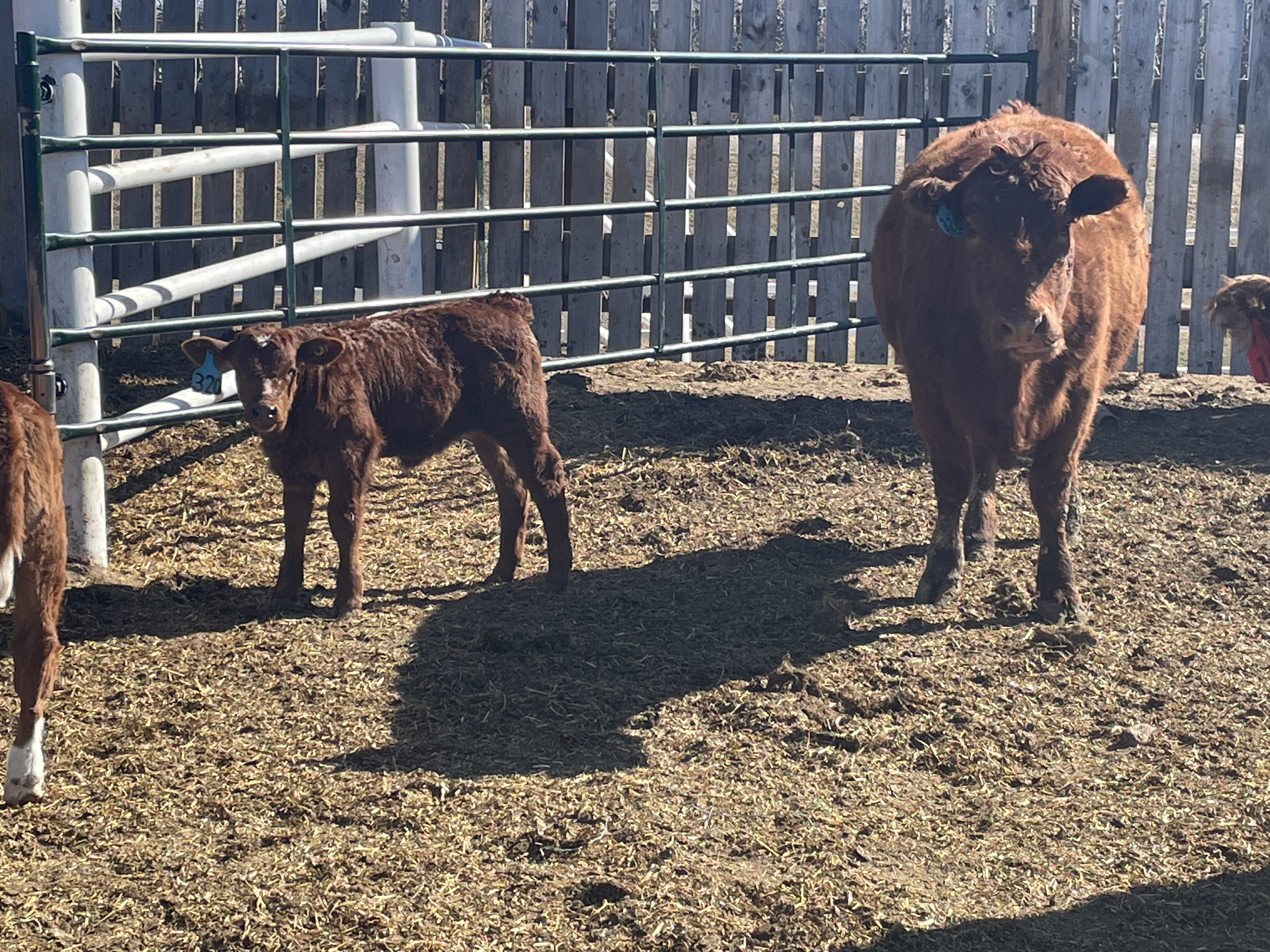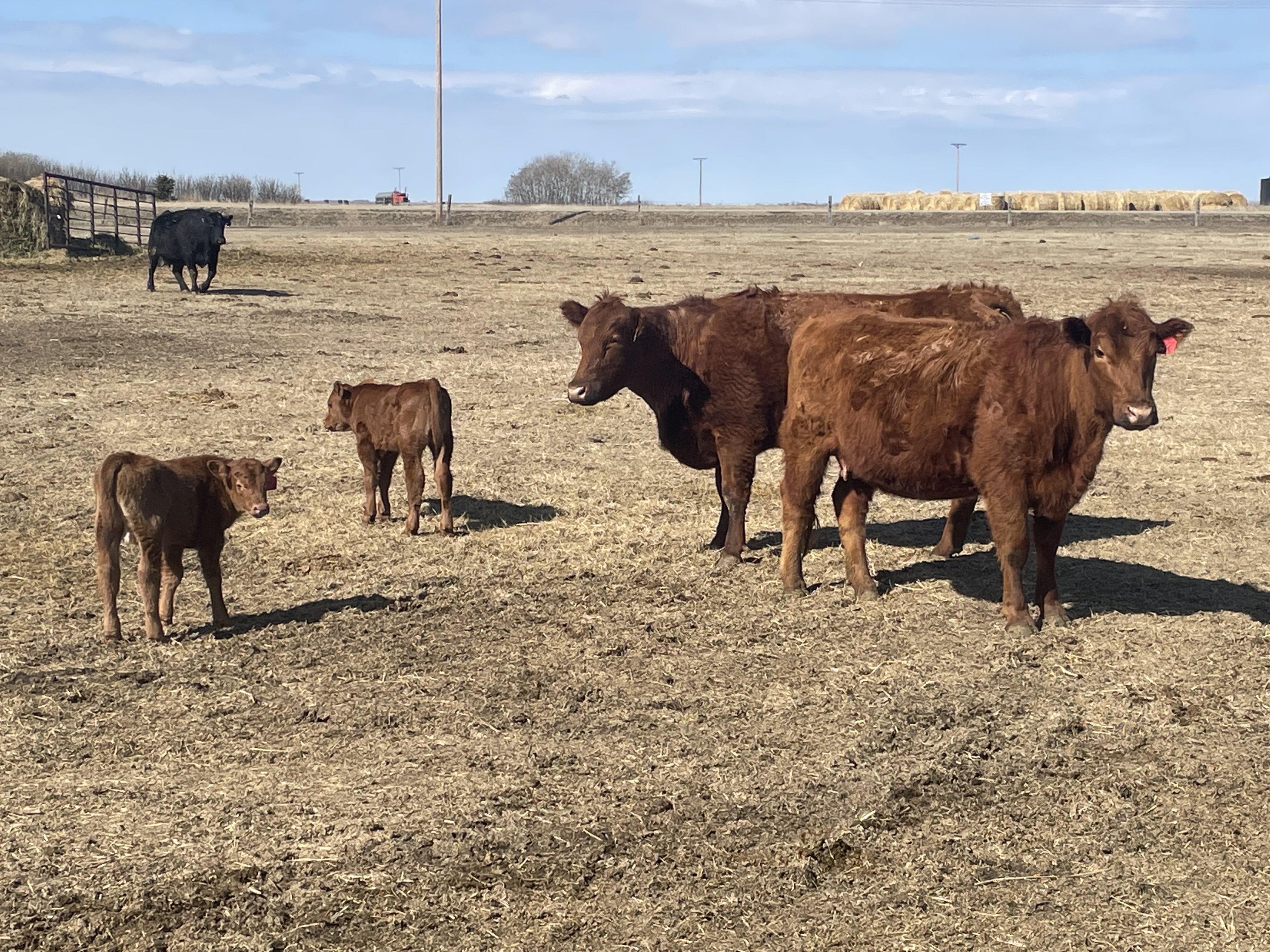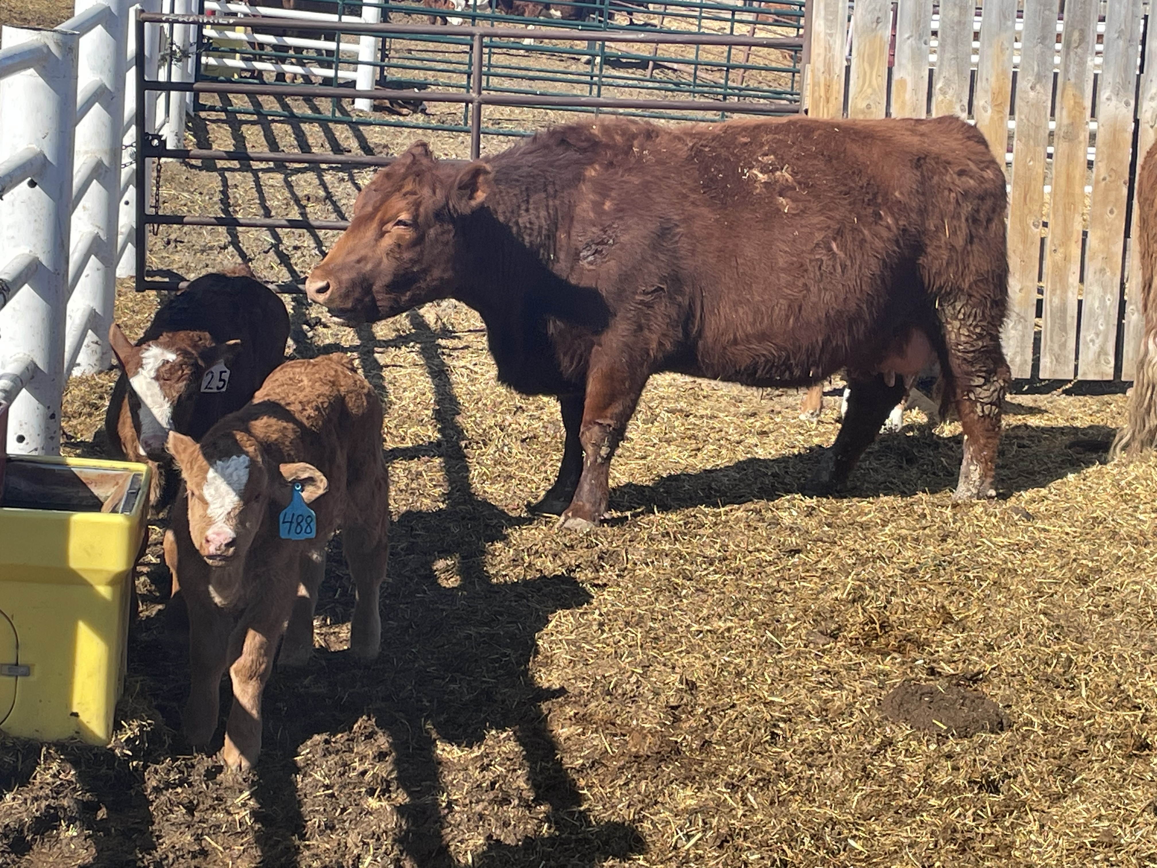 25 first calves, Red, Red Baldies and RWF Traditionals with Red & Black Angus calves at side.